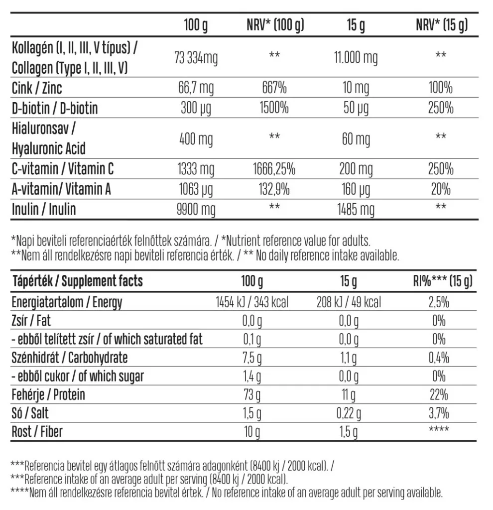 - 11.000 mg kollagén – a szervezet számára hasznosuló peptidek kombinációja.