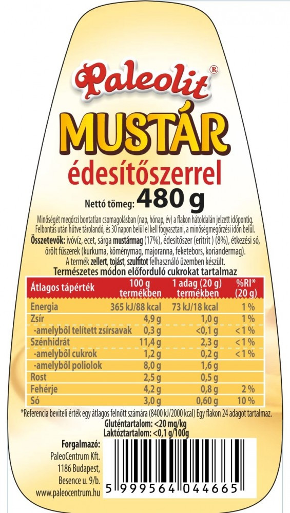 Összetevők: ivóvíz, ételecet, sárga mustármag, édesítőszer (eritrit), étkezési só, őrölt fűszerek (kurkuma, köménymag, majoranna, feketebors, koriandermag)